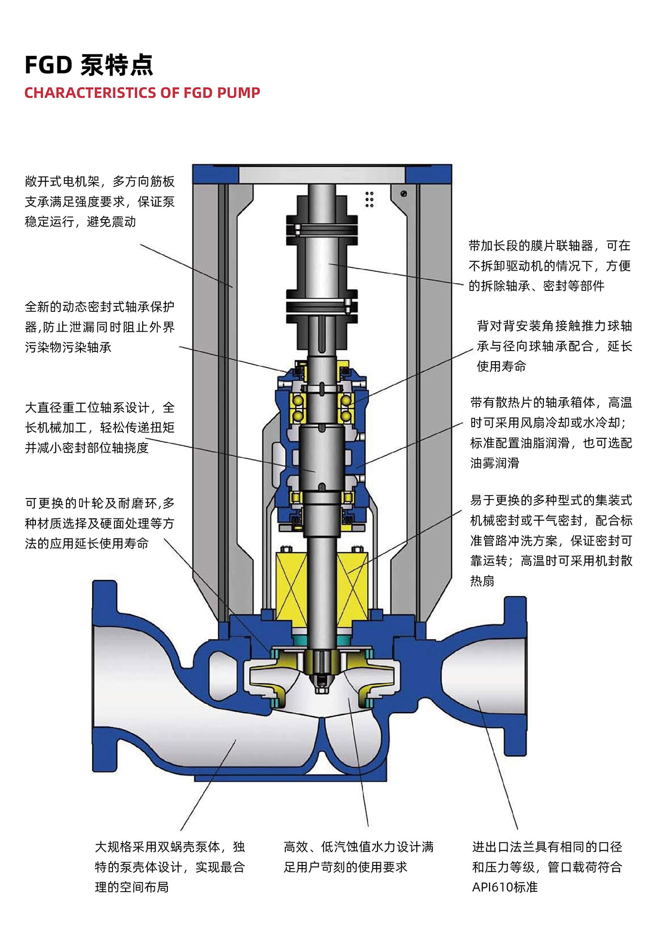 該系列泵為單級單吸徑向剖分的立式管線離心泵,該泵的設計制造符合AP1610 標準要求。泵結構符合AP1610OH3 泵型;OH3 型立式管道泵 為帶有獨立軸承架的立式管道單級懸臂式泵;本系列泵軸向力通過葉輪的前后耐磨環(huán)及平衡孔來平衡,殘余軸向力由軸承箱中止推軸承來 承受:軸承采用脂潤滑:電機安裝在與泵成一體的支架上;泵與驅動機用帶加長節(jié)性聯(lián)軸器連接。